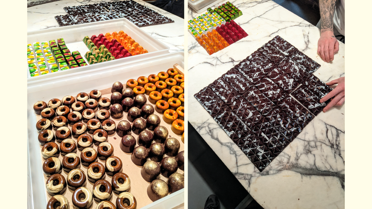 Our chocolate-making process starts with flavors. My husband and I are both foodies, so we're inspired by seasonal ingredients, nostalgic flavors, and dishes we've eaten, so we help with flavor brainstorming, but Simon is the true mastermind. Once we all land on a flavor, he works his magic. Depending on complexity, this flavor development process can take anywhere from two weeks to two months.